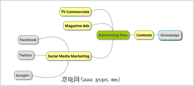 说您正在与广告团队开会以制定计划。当每个人都提供他们的想法时,请将其放入思维导图中以清晰查看。