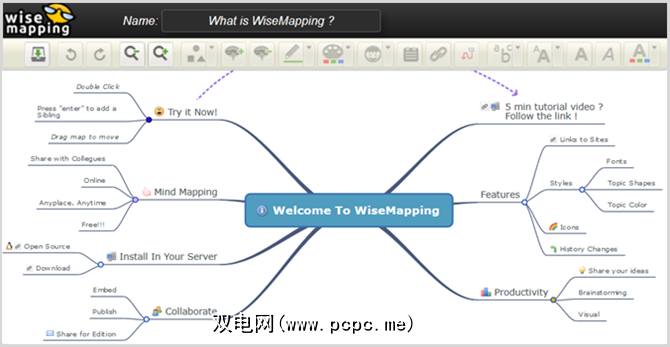 另一个不错的免费在线工具是WiseMapping。 WiseMapping具有与MindMup 2相同的易用性和直观的界面,还为节点提供了一组精美的图标和形状。您可以添加链接,包括注释,导出地图,并将其嵌入到网页中。