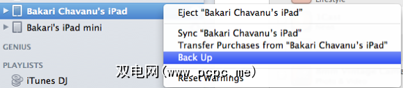 您可能要做的第一件事是备份当前内容。您的旧iPad。如果您使用无线同步已有一段时间,则应在iPad和iTunes之间建立有线连接,右键单击源窗格中的旧iPad,然后选择“ 备份"。