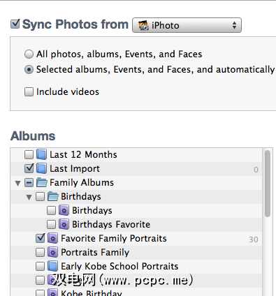 现在,请单击iTunes中的“照片"部分,然后选择iPhoto相册,您想用来填满装置的活动和面孔。我建议您还选择一些智能文件夹,当您在Mac上的iPhoto库中添加(或删除)照片时,这些文件会在设备上进行无线更新。
