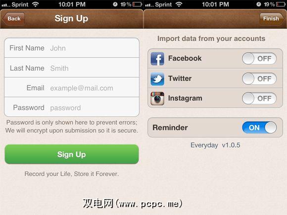 一旦您准备好开始使用Everyday.me,就可以注册一个免费帐户,然后继续连接您的Twitter,Instagram和Facebook帐户。这使得从这些网络中的每个网络自动提取您的帖子变得很容易,这确实有助于增强您的日记。当然,连接这些帐户完全是可选的,但是一旦您这样做,它将吸收您的一些旧帖子。