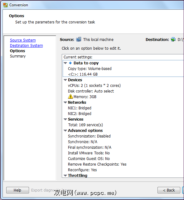 您会在“选项"部分找到许多可以自定义的选项。例如,如果系统包含多个分区,则可以指定要复制的分区–您可能只需要复制C:分区。您还可以调整其他选项,例如虚拟机的虚拟硬件,或自动执行操作,例如在生成的虚拟机中安装VMware Tools。完成配置新虚拟机后,单击“下一步"继续。