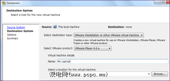 假定您正在使用消费者虚拟机。与VMware服务器产品相对应的VMware Workstation,VMware Player或VMware Fusion之类的程序,您需要将 VMware工作站或其他VMware虚拟机设置为目标类型,并指定您的VMware产品。完成后,您可以命名虚拟机并为其指定位置。
