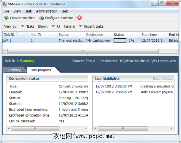 您将在VMware vCenter Converter窗口中看到进度和该操作的估计剩余时间。