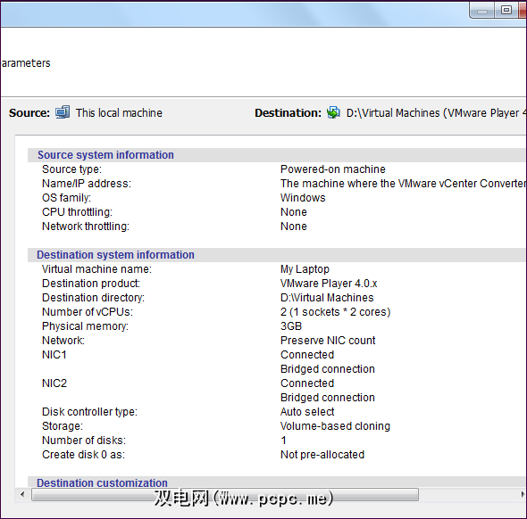 您将看到VMware vCenter Converter将执行的操作的摘要。查看操作,然后单击“完成"以继续操作。