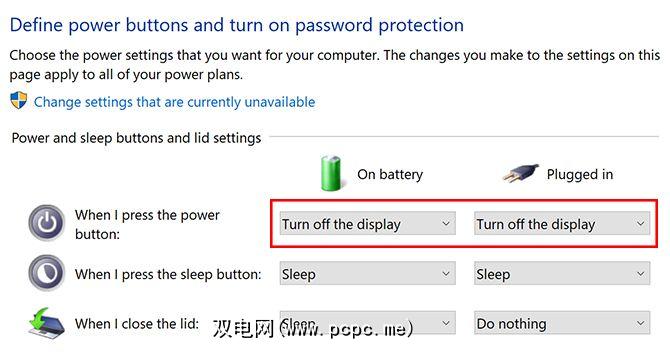 除关闭显示屏外,其他选项还包括将笔记本计算机置于关闭状态。机器进入睡眠或休眠模式或关闭计算机。您还可以选择一个设置,如果按下电源按钮,则什么也不会发生。