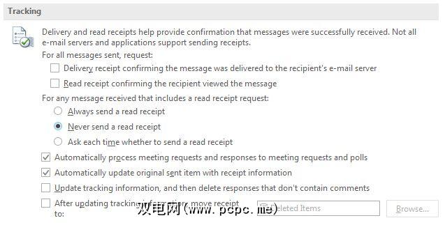 设置进入文件>选项>邮件>跟踪。您将找到有关如何确定收件人是否打开了邮件以及如何使人们知道您已收到邮件的选项。与许多其他提供已读回执的服务不同,关闭您的服务并不意味着您不会从其他人那里获得已读回执。