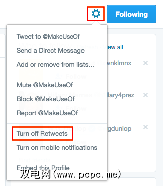 下一次让您烦恼的人转发转发风暴时,您要做的就是转到他们的个人资料,然后点击设置按钮。然后,您可以点击菜单中的关闭转发。