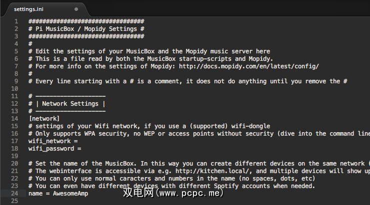 在网络设置下,输入您的WiFi详细信息并保存文件。您也可以为演讲者命名;默认名称是 MusicBox ,但我将其命名为 TheAmp 。我的第一选择 TheAwesomeAmp 太长了。