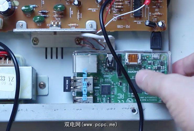 使用几条双面安装胶带,将Pi连接到放大器外壳。向下插入之前,将电源电缆和aux输入插入Pi。比以后尝试连接它们容易。放置它时,应确保它不会干扰任何放大器组件或引起任何短路。