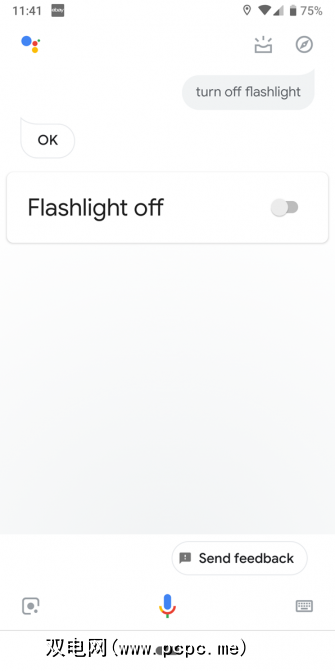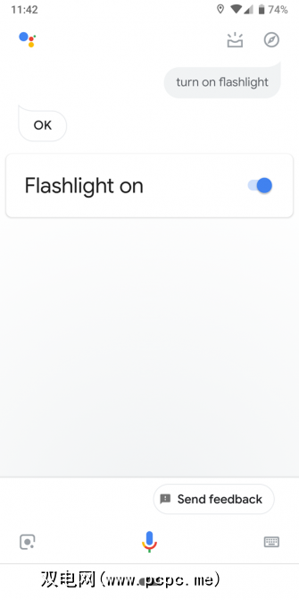 在那些时候,您可以依靠Google Assistant。 Google助手最有用的命令之一是确定Google,打开手电筒。正如您所期望的,助手会在您说出此消息后立即打开您的手电筒。要关闭此功能,您可以点击聊天窗口中显示的切换开关,或者说确定Google,关闭手电筒。