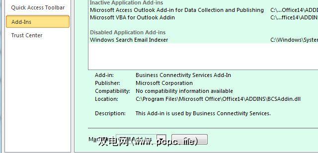 在此页面底部,您将看到一个带有下拉框的“管理"字段。选择“ COM加载项",然后单击转到按钮。
