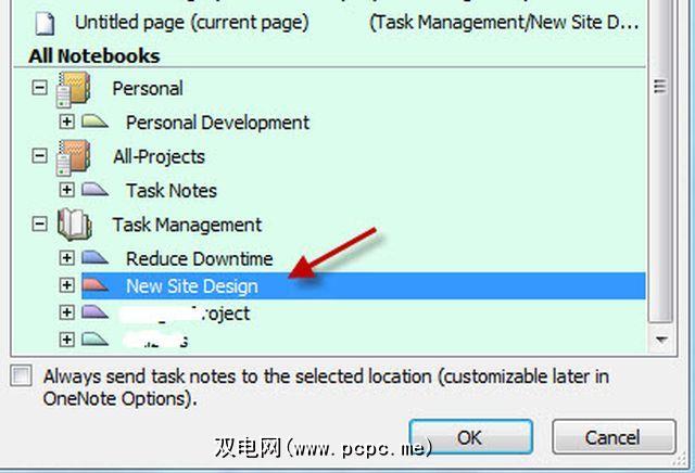 首先,OneNote将询问您要将新的“页面"放入哪个部分。在这里选择此任务所属的项目。