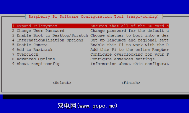 在写入图像后,将SD卡弹出到Raspberry Pi中并启动。您可以使用pi / raspberry的用户名/密码组合登录,但是稍后需要更改这些安全凭证。登录后,输入sudo raspi-config并选择Expand Filesystem以利用SD卡的全部剩余容量。