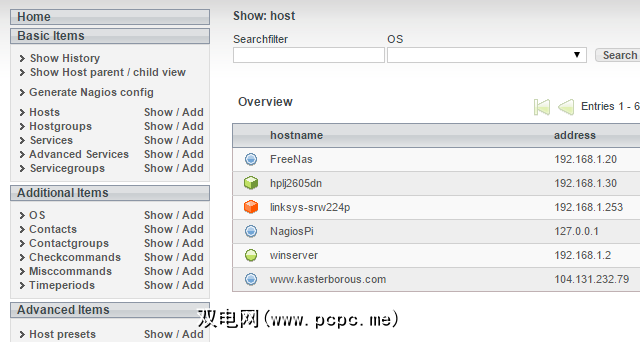 通过切换到Nagios页面,您可以很好地了解ping响应(或缺少!)的显示方式。这些默认的网络项目(由NagiosPi在您的网络上检测到)将显示。要添加自己的内容,请从NagiosPi控制台中单击 Nconf ,然后在左侧列中找到标有 Hosts 的项目。在此按钮的右侧,单击添加,然后输入要监视的设备的主机名,IP地址和别名。