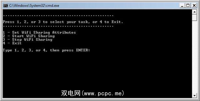 <@echo offCLS:MENUECHO.ECHO................................................ECHO.ECHO Press 1, 2, or 3 to select your task, or 4 to Exit.ECHO................................................ECHO.ECHO 1 - Set Wifi Sharing AttributesECHO 2 - Start WiFi SharingECHO 3 - Stop WiFi SharingECHO 4 - ExitECHO.SET /P M=Type 1, 2, 3, or 4, then press ENTER:IF %M%==1 GOTO SETIF %M%==2 GOTO STARTIF %M%==3 GOTO STOPIF %M%==4 GOTO EOF:SETnetsh wlan set hostednetwork mode=allow ssid=YourSSID key=YourPassword keyusage=persistentGOTO MENU:STARTnetsh wlan start hostednetworkGOTO MENU:STOPnetsh wlan stop hostednetworkGOTO MENU将文件保存到您的桌面,例如 AdHocNetwork.bat 。确保没有扩展名 .txt 。现在,当您要创建一个临时网络时,您要做的就是运行批处理文件(以管理员身份)并按照菜单提示进行操作。看起来像这样: