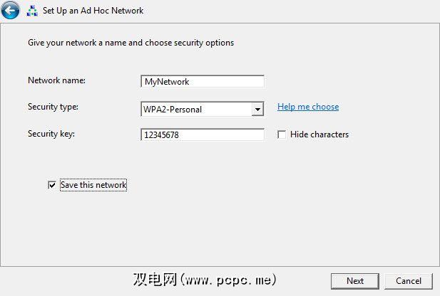 在此窗口中设置网络的名称以及网络的安全性。对于安全类型,建议使用WPA2-个人选项。 ,这样的临时连接可为您提供最佳的安全性。使用您不介意提供给他人的密码。不要回收用于其他用途(例如Facebook或银行业务)的密码。如果您这样做,很快就会后悔。如果您打算将来再次建立临时无线网络,则可以选中显示保存此网络的框,然后单击下一步按钮。