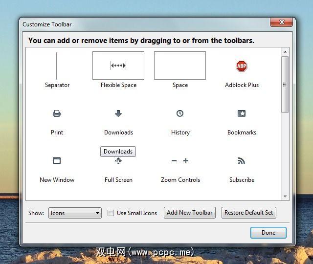 您还可以将本机功能的图标(例如书签,历史记录等)添加到这两个工具栏中。对图标的排列感到满意后,单击 Done 按钮退出对话框。