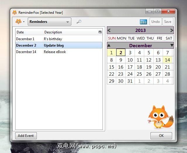 借助ReminderFox [不再可用],您可以设置提醒并快速创建待办事项列表。只需在插件主窗口侧栏中的日历中选择一个日期,单击添加事件,为您的列表项输入描述,然后点击 OK 。使用顶部的下拉菜单在提醒列表和待办事项列表之间切换。