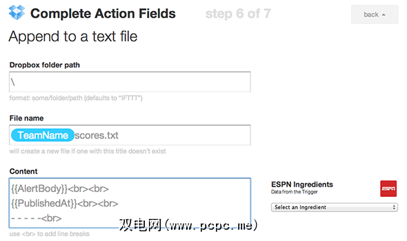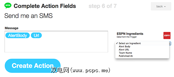默认情况下,您会看到“警报正文",这是ESPN向您发送的新闻,以及“警报URL"(大概链接)回到ESPN。删除所有不需要的信息,并知道您可以为发送的信息添加团队名称和发布时间。