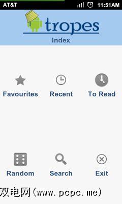 从屏幕截图中可以看到,DroidTropes的界面非常简单。您有六个选择: