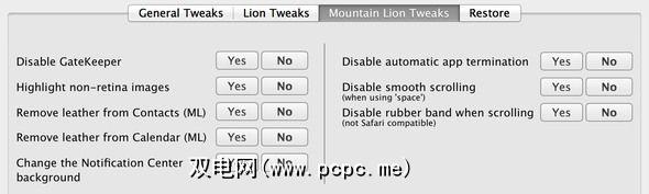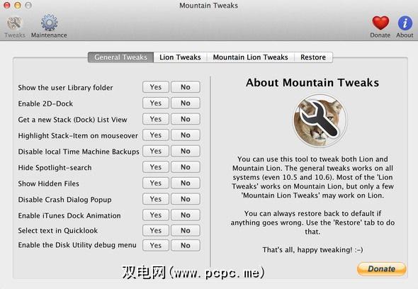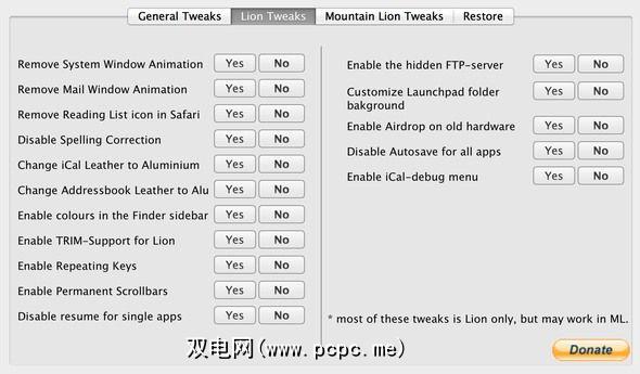 有两种版本的目前,该项目名为Lion Tweaks,另一项名为Mountain Tweaks –我敢肯定,我不必解释为什么以这种方式命名它们。据我所知(作为Mountain Lion用户),它们在调整方面基本相同,除了Mountain Lion版本附带一些针对10.8的调整。这意味着,如果您仍在使用Lion(10.7),则使用Mountain Tweaks应该没有问题。 Leopard(10.5)和Snow Leopard(10.6)的用户也应该从此应用程序中获得一些有限的里程。
