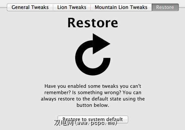 Mountain / Lion Tweaks不做的一件事就是保持您已启用的调整的统计信息,这样您就可以知道是否已启用隐藏Spotlight搜索,但对于诸如为所有应用程序禁用自动保存之类的其他调整可能并不那么明显。在这种情况下,对已启用的功能进行计数可能是节省的。如果您确实迷路了,则可以随时访问恢复标签,然后单击恢复为系统默认值,以撤消您的调整。