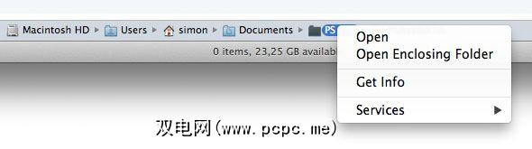双击任何中间文件夹,即可在您当前的Finder窗口中将其打开,或者在双击以在新的Finder窗口中将其打开时按住Command(cmd)键。您还可以右键单击任何路径组件以查看更多选项和与文件夹相关的服务。