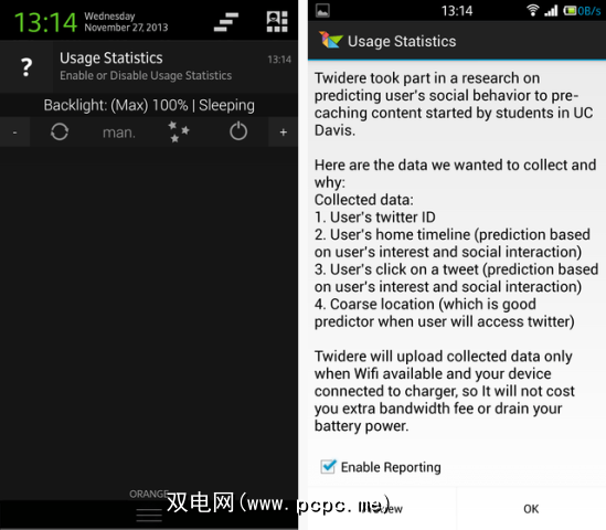 此跟踪实际上是退出,表示您最初已被跟踪-如果您碰巧在没有意识到的情况下关闭了通知,则将继续跟踪。至少Twidere对要跟踪的内容非常清楚,男孩,这相当多:您的时间轴,每次单击推文的时间和粗略的位置。 kes。很好,选择退出很容易。接下来,让我们看一下使用该应用程序的情况。