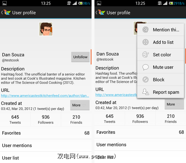 再次,我们得到的观点与Tweetings非常相似,但范围有限。值得注意的是,静音用户的转发功能的选项–实际上,这是一种聆听用户要说的内容的好方法,但不是他们必须转发的内容的方法(令人惊讶的是,这是我在其他客户端中未曾见过的)。您可以为用户设置颜色,也可以进行其他操作(将它们添加到列表中,阻止它们,等等)。