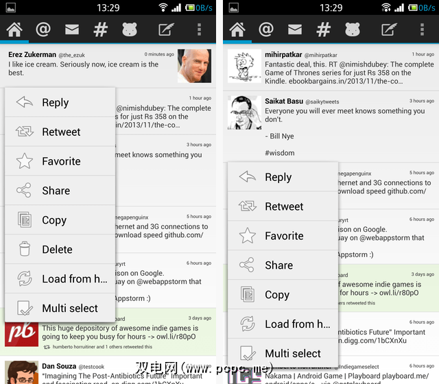 在左侧,您可以看到自己的一条推文的上下文菜单,在右侧是您的一位朋友的推文的菜单。唯一的区别是能够删除自己的tweet –但是两个菜单都使您基本上可以执行所需的任何操作,而不必进入单个tweet视图。
