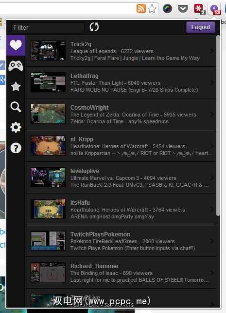 类似地,您可以单击最左侧菜单上的下一个图标(星形图标),以显示具有当前最高总流计数的流光。这是跟上任何正在进行的锦标赛或主题广播的真正好方法。