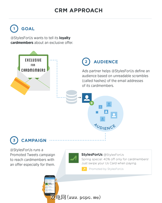 Twitter正在以两种方式处理此新程序,第一种是调用“ CRM"。允许营销人员使用已经存储在其CRM软件中的电子邮件地址将广告定位到其现有客户。例如,一家公司可能选择仅向Twitter上的现有客户推广特别优惠,而不是向社交媒体服务上的所有人开放该优惠。
