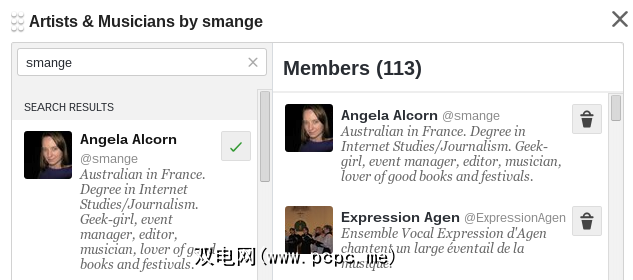 单击列表,然后单击右上角的编辑。搜索表单将出现在左侧,您可以在其中键入Twitter句柄,然后单击搜索图标。单击搜索结果中您的Twitter简历旁边的加号。在这里您可以看到我将自己添加到“艺术家和音乐家"列表中。