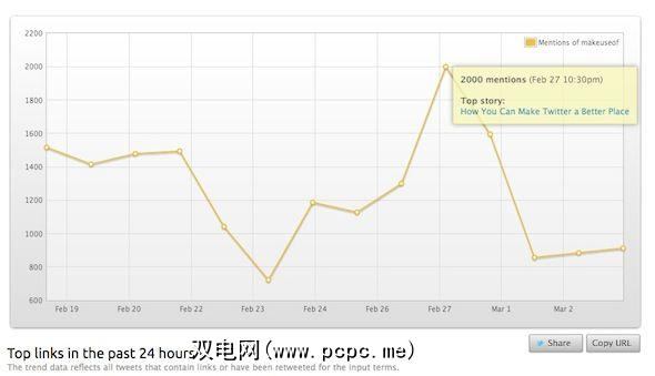 Topsy还提供了一些更漂亮的选项,包括为某些关键字创建搜索警报,在Twitter上共享您的结果,甚至提供术语分析-在图表上显示提及的数量。