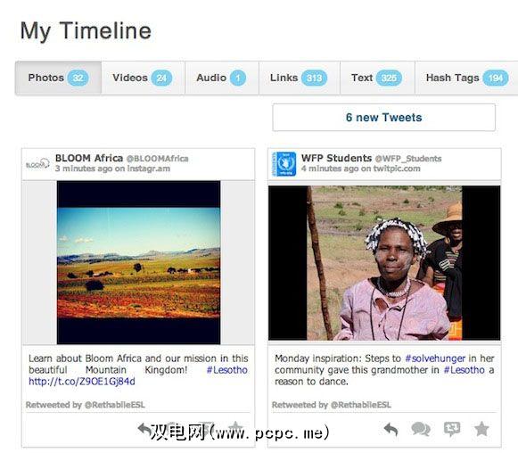 如果您想按某种类型缩小搜索范围,TwitLamp是一个很棒的Twitter搜索服务。当您首次授权TwitLamp访问您的Twitter帐户时,它将根据以下类别为您过滤时间轴:照片,视频,音频,链接,文本和主题标签。它会告诉您每个类别中包含多少条Tweet,并在有适合每个类别的新更新时通知您。