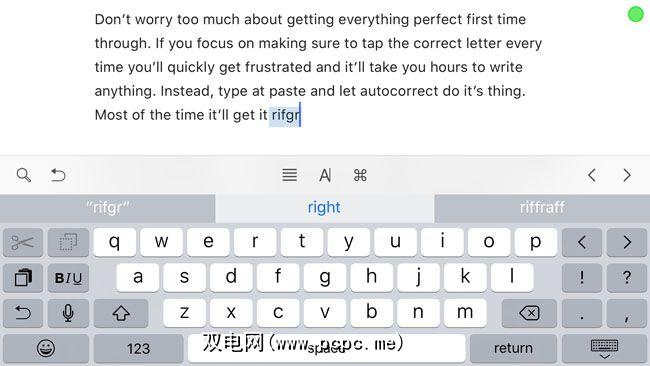 不要太担心第一次就能完美地完成所有操作。如果您专注于确保每次都点击正确的字母,则会很快感到沮丧,并且需要花费数小时才能编写任何内容。相反,应按节奏输入并让自动更正执行其操作。