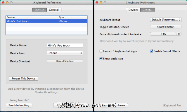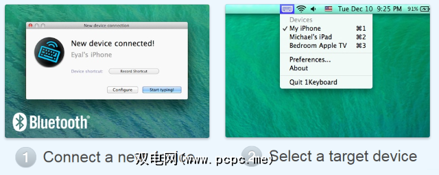通过蓝牙将iPhone或iPad连接到Mac,并且1Keyboard会识别它。您也可以连接多个设备,并使用菜单栏图标轻松地在它们之间切换。