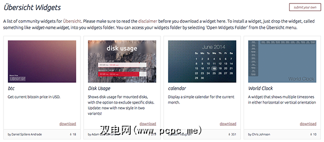 像其他任何Mac应用一样下载并安装Übersicht,启动它,然后在右上角的系统托盘中找到一个新条目。接下来,转到Übersicht小部件页面,您会发现一小部分要添加到桌面的内容: