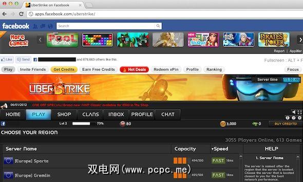 在撰写本文时,有三个网站可以玩UberStrike。首先,在UberStrike.com上。就像桌面客户端一样,它的优点是不会被迫(但仍然能够)使用您的Facebook帐户连接到游戏。如果您不介意(或碰巧喜欢)Facebook集成,也可以在Facebook上播放它,如上面的屏幕截图所示。最后,UberStrike最近已推出到Kongregate。