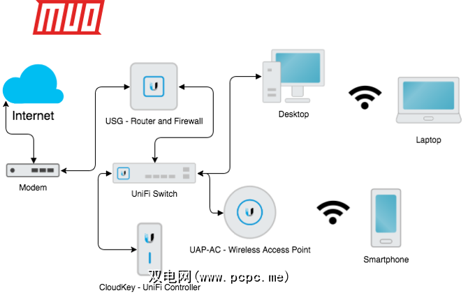 在上图中,我们看到了Ubiquiti UniFi如何将这些角色拆分为多个设备。这使网络更具可扩展性,并且具有容错能力。例如,如果其中一个接入点停止运行,则只需替换该接入点,而不是替换整个网络。让我们看看它们如何组合在一起。
