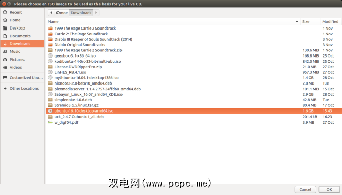 选择了语言包,启动语言和桌面环境后,您需要指定一个ISO映像。这将作为您的现场CD。我使用了Ubuntu 16.10 ISO。只要是基于Ubuntu的ISO,任何都应该工作。您需要选择一个名称。如果要创建多个ISO,请使用唯一的名称,以免混淆。