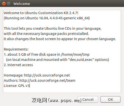 UCK会显示一个友好的欢迎屏幕,其中包含诸如您当前发行版(我的发行版为16.04)之类的信息。您的 / home / usr / tmp 文件夹中需要约5 GB的可用空间以及互联网访问权限。点击确定继续。