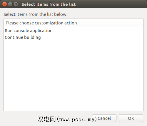 现在,您会看到一个选择动作的选项。在这里,您选择“继续构建"或“运行控制台应用程序"。要进行自定义,请选择运行控制台应用程序并使用
