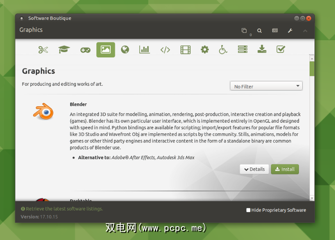 尽管Linux上有很多应用商店,但Ubuntu MATE使用自己的商店,称为Software Boutique。它以一种欢迎新用户的方式组织和展示应用程序。一些页面显示应用可以替换哪些流行的商业应用。例如,Blender可以替代Adobe After Effects和Autodesk 3ds Max。