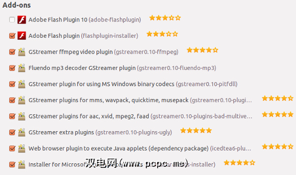 不确定这些是什么意思吗?最上面的“ flashplugin-installer"将Adobe Flash安装在您的系统上。各种“ gstreamer"软件包向Gstreamer添加了编解码器,Ubuntu视频和音乐播放器均使用它们打开文件。 “ IcedTea"是Java的浏览器插件,在列表中后面是几个其他编解码器。 mscorefonts软件包为您提供Times New Roman,Arial和其他Windows标准字体。 Unrar会执行以下操作:打开RAR文件。