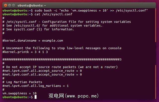 这会将 vm.swappiness = 10 行添加到文件末尾,这是安全的,因为它是其中唯一的一行没有注释掉的文件。通常,在文件中未定义vm.swappiness,并将其设置为默认值。重新启动计算机,以使更改生效。