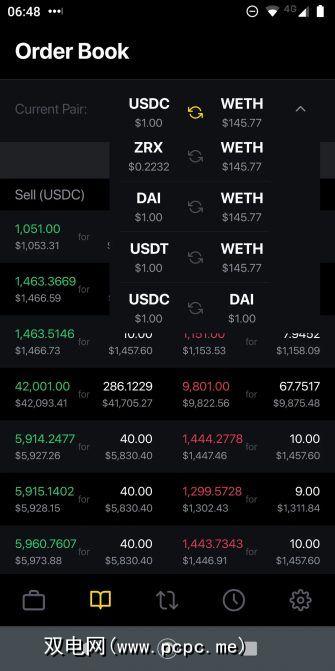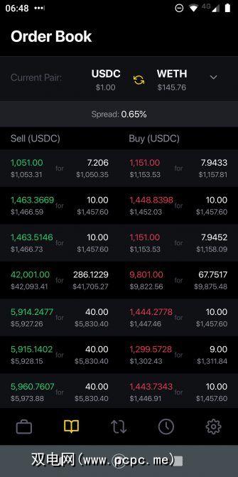 “订单簿"屏幕可让您查看UDEX当前可用的未结订单。您可以在屏幕顶部更改货币对。在货币对的正下方,您可以看到当前的价差。