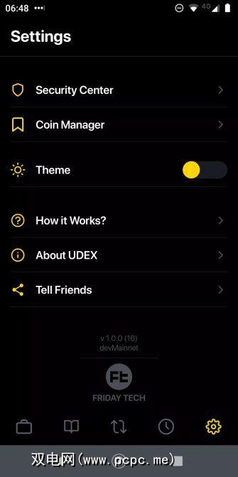 最后一个屏幕是您可以进行调整的地方该应用程序可以满足您的喜好。但是,也许最重要的功能是安全中心。您可以在其中找到恢复短语(设置>安全中心>电子钱包备份)。确保记下这12个单词的短语。如果您丢失或损坏了手机,则需要输入短语以重新获得金币。 没有这句话,您的资产将永远被锁定。 UDEX团队无法帮助您恢复丢失的短语。