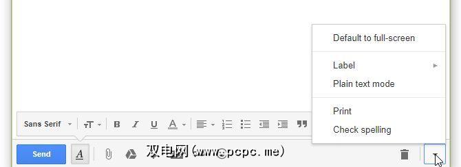 在这里,您可以切换到全屏编辑模式,立即为该外发电子邮件选择一个标签,切换到纯文本模式(不格式化),打印电子邮件,或检查拼写(习惯上这不是一件坏事)